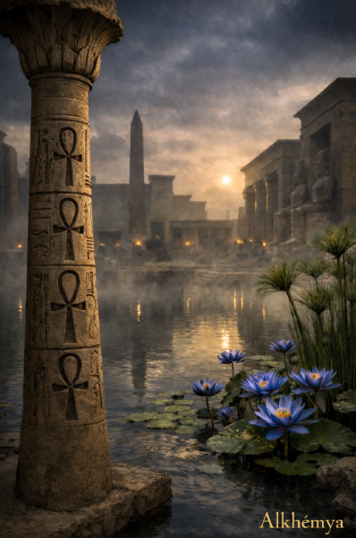 À leur surface, la barque solaire accomplissait son trajet symbolique, rappelant le mouvement cyclique de la vie, de la mort et du renouveau. Le parfum accompagnait ces traversées, soutenant la conscience et inscrivant chaque geste dans un temps sacré. Lumière de Ankh plonge ainsi dans l’atmosphère des Mystères d’Égypte, là où le souffle, l’eau et la fleur devenaient des voies de transformation intérieure.
